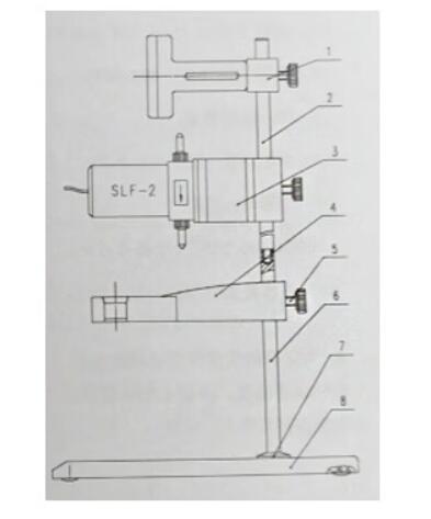 (1)夹形件部件(2)电极杆(3)电磁阀部分(4)电极支持件(5)紧固螺丝(6)电极杆(7)电极杆固定眼(8)仪器主机(9)磁力搅拌器